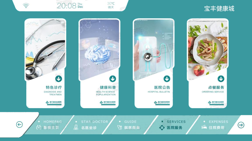 佳視通多媒體互動(dòng)電視——醫(yī)院篇 佳視通多媒體互動(dòng)電視—醫(yī)院篇,開機(jī)視頻播放完自動(dòng)跳轉(zhuǎn)到首頁,電視直播實(shí)時(shí)新聞動(dòng)態(tài),首頁可實(shí)現(xiàn)醫(yī)院介紹、醫(yī)院名稱、日期、時(shí)間等內(nèi)容,支持中英文切換模式,醫(yī)院頁面背景圖片支持自定義、根據(jù)醫(yī)院的風(fēng)格部署不同的背景圖片。 1、定制開機(jī)視頻,界面上面板塊顯示醫(yī)院LOGO、時(shí)間、日期、位置、天氣等; 2、強(qiáng)制插播緊急通知/視頻,左邊視頻展示板塊,可以自定義播放實(shí)時(shí)新聞動(dòng)態(tài)。可以播放醫(yī)院的宣傳視頻等資源; 3、右邊圖片展示區(qū)域,滾動(dòng)播放、功能板塊6個(gè),可以自主編輯名稱;